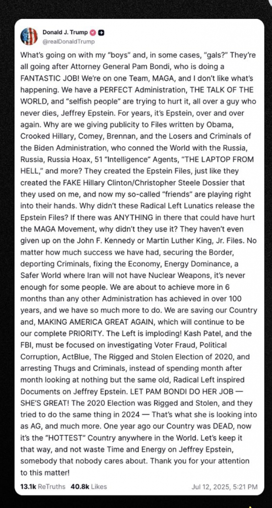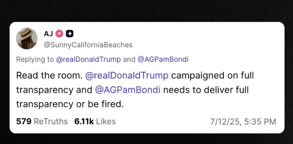 Messaggio di una elettrice MAGA a Trump via social media: Renditi conto di che aria tira. Donald Trump hai basato la campagna sulla piena trasparenza e Pam Bondi (procuratore a capo del dipartimento per la Giustizia) deve assicurare massima trasparenza o essere licenziata.
