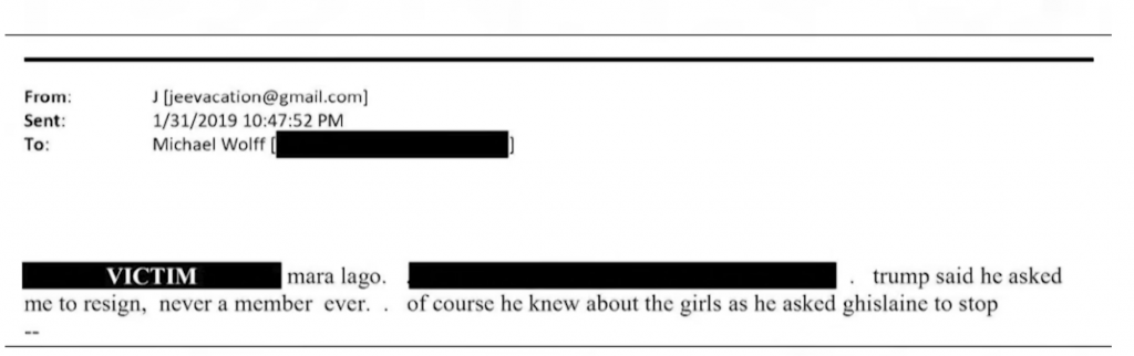 OMISSIS SUL NOME DELLA VITTIMA mara lago, OMISSIS trump ha detto di avermi chiesto di dimettermi, senza mai essere stato un membro, naturalmente lui sapeva delle ragazze e ha chiesto a Ghislaine (Maxwell, compagna di Epstein) di smettere.