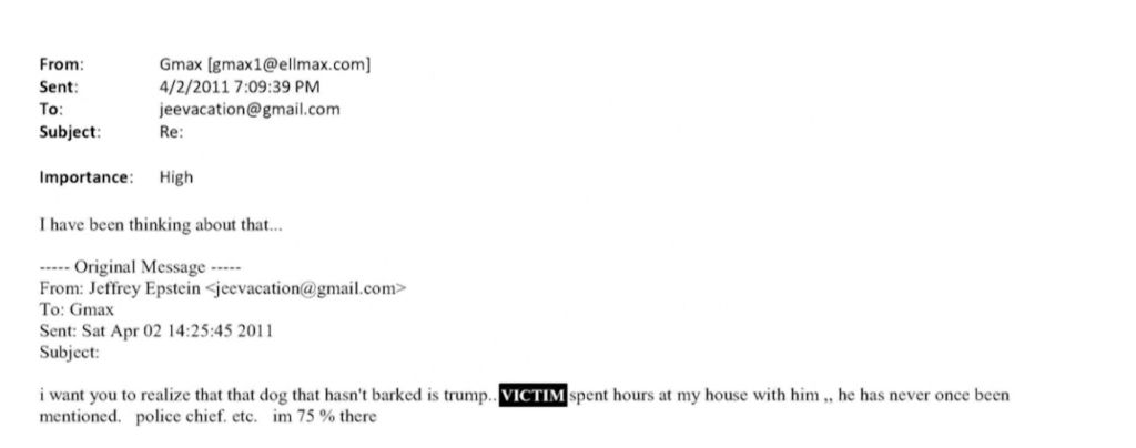 In una mail inviata il 2 aprile 2011 a Ghislaine Maxwell, nel contesto delle interviste ai tabloid rilasciate in quei giorni dalla vittima di traffico sessuale Virginia Giuffre, J.Epstein scrive: “Vorrei che tu realizzassi che il cane che non ha abbaiato è Trump … OMISSIS sul nome della vittima, ha speso delle ore a casa mia con lui, e lui non è mai stato menzionato, il capo della polizia etc, io ci sono il 75% delle volte”. Maxwell risponde con una breve nota: “I have been thinking about that,” confermando l’osservazione di Epstein.