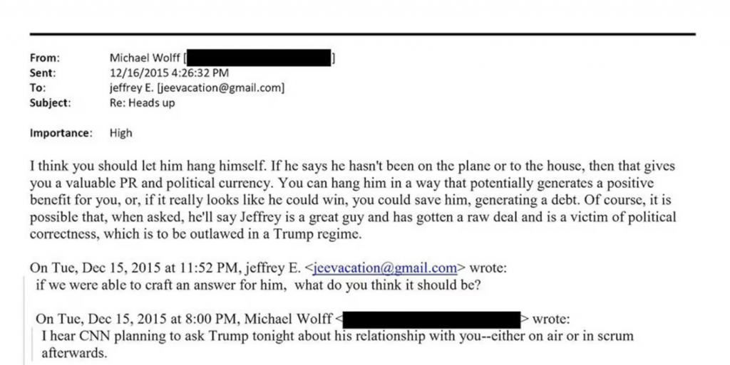 “Ho sentito che la CNN ha intenzione di chiedere stasera a Trump del suo rapporto con te — o in diretta o subito dopo.” Epstein rispose chiedendo: “Se dovessimo preparargli una risposta, quale pensi che dovrebbe essere?” Il giorno successivo Wolff replicò: “Penso che dovresti lasciarlo impiccarsi da solo. Se dice di non essere mai stato sull’aereo o a casa tua, allora questo ti dà un prezioso vantaggio di PR e politico. Puoi usarlo in un modo che potenzialmente ti generi un beneficio positivo oppure, se davvero sembra che possa vincere, potresti salvarlo, generando un debito. Naturalmente, è possibile che, se interrogato, dica che Jeffrey è un bravo ragazzo, che è stato trattato ingiustamente ed è una vittima del politicamente corretto, che in un regime come quello di Trump sarebbe messo fuori legge.”