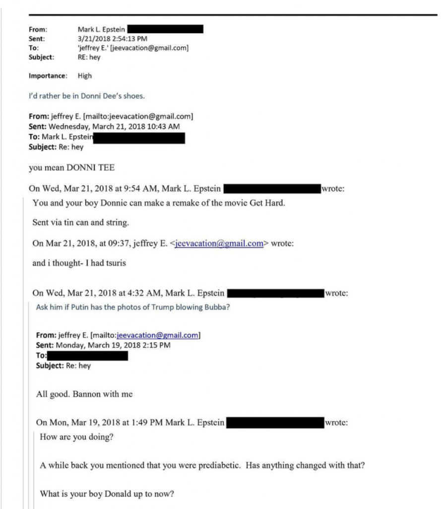 Nel fine settimana è salito alla ribalta un messaggio scritto dal fratello di Jeffrey, Mark Epstein, il 21 marzo 2018. Mark chiede come stia il fratello e notizie dell’amico Donald. Jeffrey risponde: “va tutto bene”, “Bannon è con me”. Mark allora chiede a Jeffrey di verificare tramite Steve Bannon, allora stratega di Trump, se Vladimir Putin possedesse “le foto di Trump che fa sesso orale a ‘Bubba’” (“Ask him if Putin has the photos of Trump blowing Bubba”). Dopo la frase su Putin, Jeffrey risponde con una battuta in yiddish: “and I thought – I had tsuris” (“e io pensavo di avere dei guai”). Mark chiude il messaggio citando il film Get Hard, “diventare duro” : “Tu e il tuo amicone Donnie potreste fare un remake del film diventare duro.”